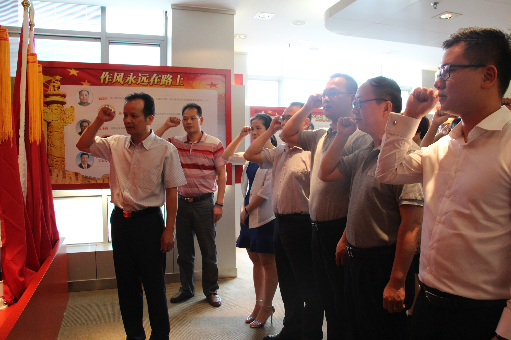 在全體黨員的見(jiàn)證下,黃主任與集團(tuán)黨委領(lǐng)導(dǎo)共同為黨建活動(dòng)室揭牌并合影留念。