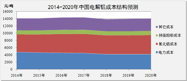 加權(quán)成本結(jié)構(gòu)。2014年我國氧化鋁生產(chǎn)成本主要由氧化鋁、電力及預(yù)焙陽極三個方面構(gòu)成。其中,氧化鋁成本為4846.4元/噸,占比34.4%;電力成本為4809元/噸,占比34.1%;預(yù)焙陽極成本為1169.6元/噸,占比8.3%。研究預(yù)測,2015-2020年期間氧化鋁成本占比將逐步提升至37.7%,電力成本占比將逐步下降至29.9%,預(yù)焙陽極成本占比穩(wěn)定。