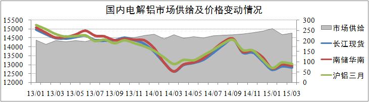 自2014年9月份全國鋁價出現(xiàn)高位回落以來,今年前三月份鋁價基本在12800元/噸-13100元/噸的區(qū)間內(nèi)波動。市場供給方面,2015年1-2月全國產(chǎn)量分別為262萬噸和232萬噸,同比增長率約為8%,市場供給并未出現(xiàn)實質(zhì)性的縮減。目前,全國電解鋁市場價格已整體逼近2013年以來的最低水平,預(yù)計上半年將進一步跌破至12500元/噸關(guān)口,下半年鋁價將出現(xiàn)整體回升。