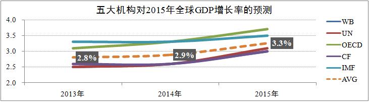 發(fā)稿時間:2015-04-11根據(jù)世界銀行(World Bank)、聯(lián)合國(United Nations)、經(jīng)濟合作與發(fā)展組織(OECD)、英國共識公司(Consensus Forecasts)及國際貨幣基金組織(IMF)等五大國際權(quán)威機構(gòu)的預(yù)測,2015年全球經(jīng)濟形勢整體好于2014年,下半年全球經(jīng)濟增速將會有較為顯著的回升,其中主要得益于全球貿(mào)易的逐步增長、通貨膨脹及失業(yè)率的繼續(xù)走低,預(yù)計全年全球GDP加權(quán)平均增速為3.3%,較2014年提升0.4個百分點。