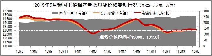 發(fā)稿時(shí)間:2015-06-17市場(chǎng)運(yùn)行低位偏冷。市場(chǎng)供給方面,5月份我國(guó)電解鋁產(chǎn)量為256萬(wàn)噸,環(huán)比基本持平,同比增長(zhǎng)12%,市場(chǎng)供給穩(wěn)定?,F(xiàn)貨價(jià)格方面:5月份電解鋁現(xiàn)貨價(jià)格基本擺脫了年初快速下滑的頹勢(shì),目前國(guó)產(chǎn)現(xiàn)貨價(jià)格基本穩(wěn)定在13000元/噸-13150元/噸的區(qū)間范圍。從價(jià)格波動(dòng)趨勢(shì)上看,5月份電解鋁現(xiàn)貨市場(chǎng)價(jià)格略高于去年同期水平,但尚未出現(xiàn)季節(jié)性反彈跡象。