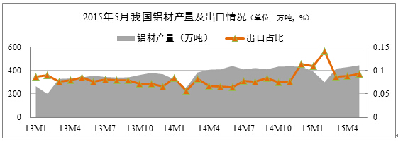 發(fā)稿時間:2015-07-17鋁材市場保持較快增長。監(jiān)控數據顯示,自3月以來,我國鋁材月度產量均保持兩位數的增長速度,其中5月份全國鋁材產量444萬噸,累計同比增長10.7%,增幅環(huán)比回落1.6個百分點。從區(qū)域分布上看,山東、河南以及廣東仍然保持鋁材產量前三的位置,其中廣東5月份鋁材產量49萬噸,全國占比11%,但同比增速較上月回落了6%,降幅收窄0.3個百分點。