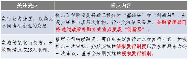 新三板市場再迎里程碑。中國證監(jiān)會于11月20日發(fā)布了《關(guān)于進(jìn)一步推進(jìn)全國中小企業(yè)股份轉(zhuǎn)讓系統(tǒng)發(fā)展的若干意見》,進(jìn)一步明確了新三板的獨立市場地位和立足于服務(wù)創(chuàng)新型、創(chuàng)業(yè)型和成長型中小微企業(yè)的市場定位,同時為企業(yè)在證券市場的轉(zhuǎn)板預(yù)留了空間。此外,《意見》“現(xiàn)階段暫不實行連續(xù)競價交易”的規(guī)定在一定程度上限制了企業(yè)的板內(nèi)融資便利性。