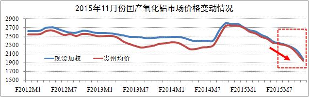 國內(nèi)價(jià)格方面:統(tǒng)計(jì)期內(nèi),全國氧化鋁市場(chǎng)價(jià)格繼續(xù)保持了今年以來的下行趨勢(shì),且下行幅度有所擴(kuò)大。其中:11月國產(chǎn)現(xiàn)貨加權(quán)1985元/噸,環(huán)比下降8.3%,降幅環(huán)比擴(kuò)大了4.1個(gè)百分點(diǎn);貴州均價(jià)1947元/噸,環(huán)比下降7.4%,降幅環(huán)比擴(kuò)大了1.4個(gè)百分點(diǎn)。研究認(rèn)為,目前氧化鋁市場(chǎng)價(jià)格直線下浮屬于異?,F(xiàn)象,主要原因是電解鋁做空力量加劇了市場(chǎng)悲觀預(yù)期。