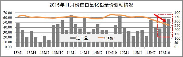 進(jìn)口市場(chǎng)方面:統(tǒng)計(jì)期內(nèi),進(jìn)口氧化鋁市場(chǎng)價(jià)格波動(dòng)趨勢(shì)基與國內(nèi)市場(chǎng)基本一致。進(jìn)口量方面,10月全國進(jìn)口氧化鋁58萬噸,11月進(jìn)口56萬噸,較去年同期增長27%,環(huán)比有所回落;價(jià)格方面,11月CIF均價(jià)319美元,折合人民幣2040元/噸,環(huán)比下降5.1%。進(jìn)口價(jià)格持續(xù)下跌折射出國際有色市場(chǎng)的悲觀氣氛仍在持續(xù),而內(nèi)外價(jià)差將會(huì)轉(zhuǎn)化進(jìn)口需求為國產(chǎn)需求。
