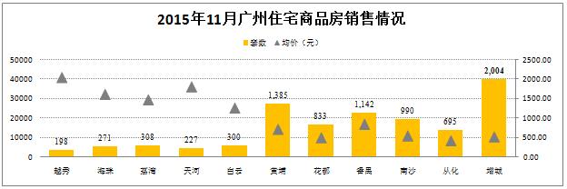 網(wǎng)簽數(shù)據(jù)顯示,11月份廣州地區(qū)住宅商品房共銷售8353套,環(huán)比上升1.2%,其中增城區(qū)銷售套數(shù)位居榜首;全市均價(jià)為15657元/平方,環(huán)比上升11.6%,其中增城區(qū)銷售均價(jià)為10608元/平方,略高于花都及從化均價(jià)。11月份住宅商品房量?jī)r(jià)齊漲的主要原因是政策效果顯現(xiàn),購(gòu)房需求逐漸增強(qiáng)。
