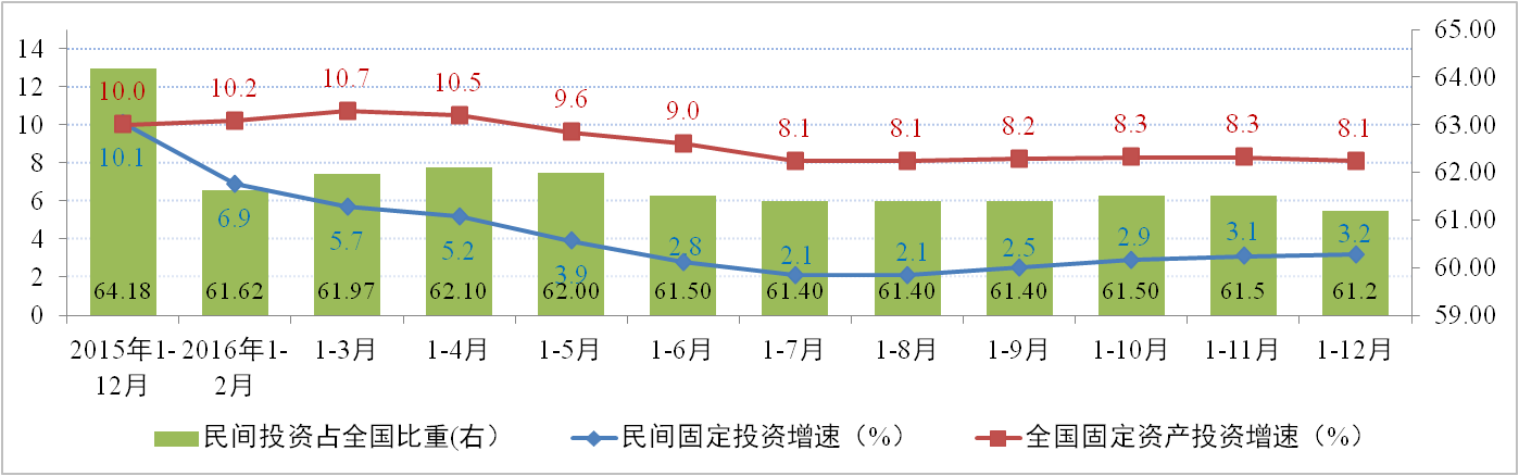 據(jù)國家統(tǒng)計局統(tǒng)計數(shù)據(jù)顯示,2016年1-12月,全國固定資產(chǎn)投資同比名義增長8.1%,環(huán)比回落0.2個百分點。民間固定資產(chǎn)投資同比名義增長3.2%,環(huán)比上升0.1個百分點。民間固定資產(chǎn)投資占全國固定資產(chǎn)投資(不含農(nóng)戶)的比重為61.2%,環(huán)比下降0.3個百分點。