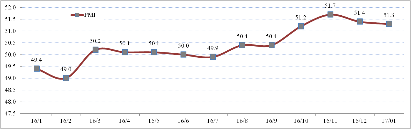 國家統(tǒng)計局數(shù)據(jù)顯示,2017年1月份,中國制造業(yè)采購經(jīng)理指數(shù)(PMI)為51.3%,比上月微落0.1個百分點,連續(xù)6個月站上50%的榮枯線,延續(xù)平穩(wěn)擴張態(tài)勢。其中,生產(chǎn)指數(shù)和新訂單指數(shù)分別為53.1%和52.8%,分別較上月回落0.2和0.4個百分點??偟膩砜?,反映供需變化的生產(chǎn)和新訂單指數(shù),延續(xù)去年四季度以來向好態(tài)勢,說明當前供需基本面良好,增長態(tài)勢均衡。