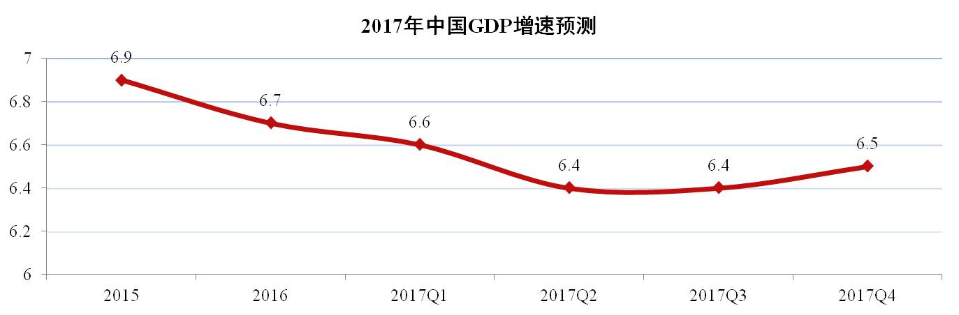 2017 年政府工作報(bào)告中稱,基于國(guó)外復(fù)雜的經(jīng)濟(jì)形勢(shì)以及國(guó)內(nèi)推進(jìn)供給側(cè)改革的需要,2017年中國(guó)經(jīng)濟(jì)將繼續(xù)維持平穩(wěn)增長(zhǎng),全年GDP增長(zhǎng)目標(biāo)預(yù)期為6.5%,較2016年下降0.2個(gè)百分點(diǎn)。預(yù)計(jì)經(jīng)濟(jì)增長(zhǎng)將呈現(xiàn)“前高后低”格局,經(jīng)濟(jì)減緩的幅度將逐步減小,并不斷向潛在經(jīng)濟(jì)增速收斂??紤]去年4季度經(jīng)濟(jì)企穩(wěn)回升(4季度6.8%,前三季度6.7%),今年以來(lái)經(jīng)濟(jì)活動(dòng)繼續(xù)保持較強(qiáng)增長(zhǎng)勢(shì)頭。預(yù)計(jì)2017年國(guó)內(nèi)經(jīng)濟(jì)形勢(shì)將逐漸明朗,轉(zhuǎn)折點(diǎn)或出現(xiàn)在第三季度。