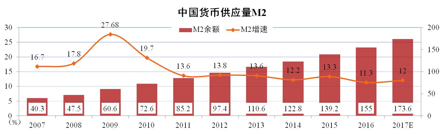 兩會(huì)期間李克強(qiáng)總理在政府工作報(bào)告中指出, 2017年貨幣政策要保持穩(wěn)健中性。因此,廣義貨幣M2預(yù)期增長(zhǎng)均為12%左右。在2016年政府工作報(bào)告提出廣義貨幣M2預(yù)期增長(zhǎng)在13%左右;但央行發(fā)布的2016年金融統(tǒng)計(jì)數(shù)據(jù)報(bào)告顯示,2016年廣義貨幣供應(yīng)量(M2)余額155.0萬(wàn)億元,僅比上年增長(zhǎng)11.3%。