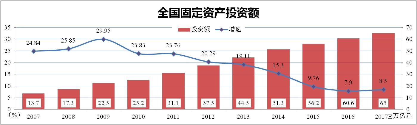 分析認(rèn)為:2016年以來(lái),中國(guó)固定資產(chǎn)投資累計(jì)增速的下滑態(tài)勢(shì)得以遏制。預(yù)計(jì)2017年固定資產(chǎn)投資緩中趨穩(wěn)、穩(wěn)中向好的態(tài)勢(shì)會(huì)仍然持續(xù),固定資產(chǎn)投資增速呈現(xiàn)小幅波動(dòng)、穩(wěn)中有升的可能性較大,全年投資總額將達(dá)65萬(wàn)億元,增速或維持在8.5%左右。
