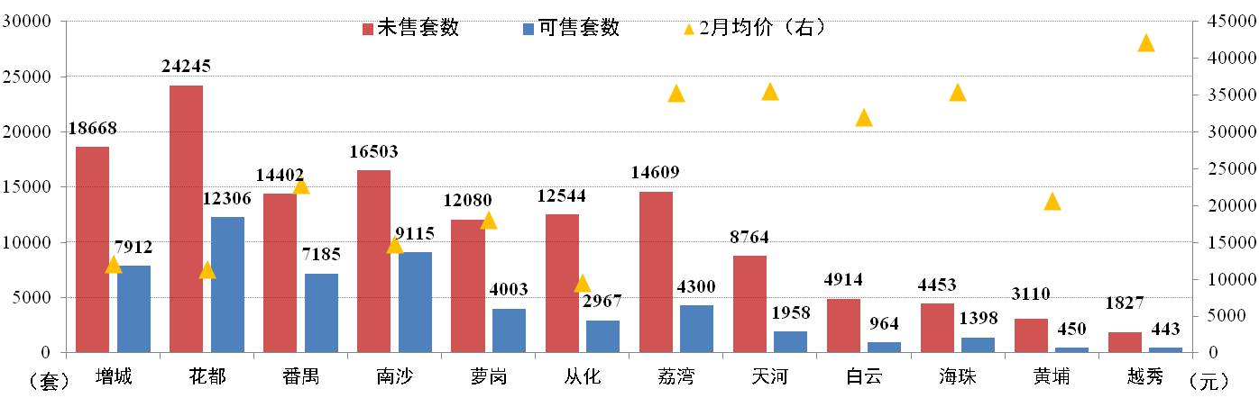 截止2月28日,廣州市新建住宅商品房共189,120套,環(huán)比減少0.83%。其中可售和未售房源分別為53,001套和136,119套,花都、增城、南沙以及番禺四區(qū),合計分別占68.9%和54.23%;增城分別占14.9%和13.7%。