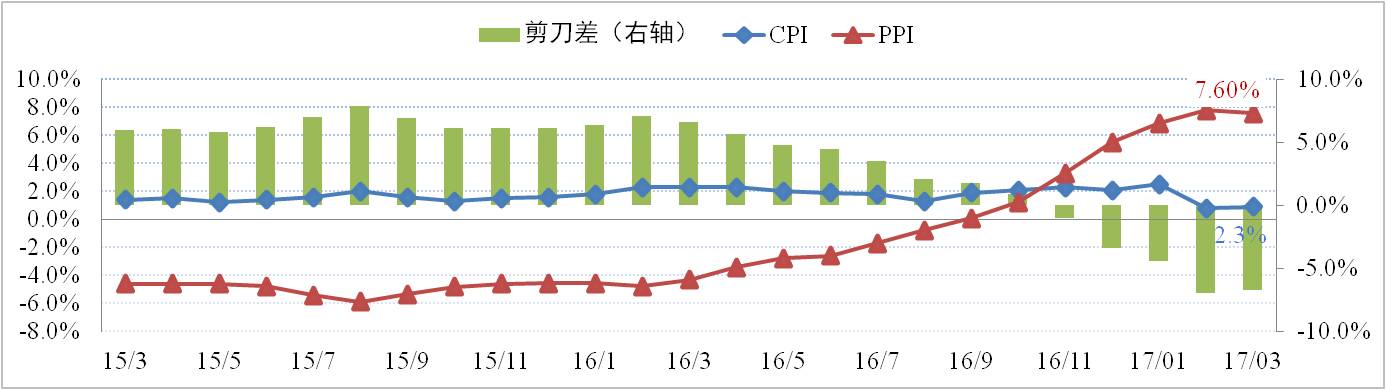 一季度國內(nèi)經(jīng)濟呈現(xiàn)投資回升、貿(mào)易趨勢性向好,PMI、CPI、PPI等主要經(jīng)濟指標數(shù)據(jù)均呈現(xiàn)向好局面,因此預計一季度GDP增長6.8%。但國內(nèi)經(jīng)濟仍然呈現(xiàn)出工業(yè)生產(chǎn)穩(wěn)以及消費數(shù)據(jù)弱的格局,主要表現(xiàn)在價格層面上PPI與CPI的剪刀差仍高,3月份CPI同比上漲0.9%連續(xù)兩個月同比增長低于1%;PPI同比上漲7.6%,環(huán)比回落0.2個百分點漲幅依然處于高位。國內(nèi)經(jīng)濟增長面臨的風險主要來自金融和房地產(chǎn)風險兩個方面;其中,主要包括債務違約和債務處置負擔沉重、房地產(chǎn)投資和民間投資增速下滑、去杠桿、去產(chǎn)能和隱性失業(yè)問題等風險。