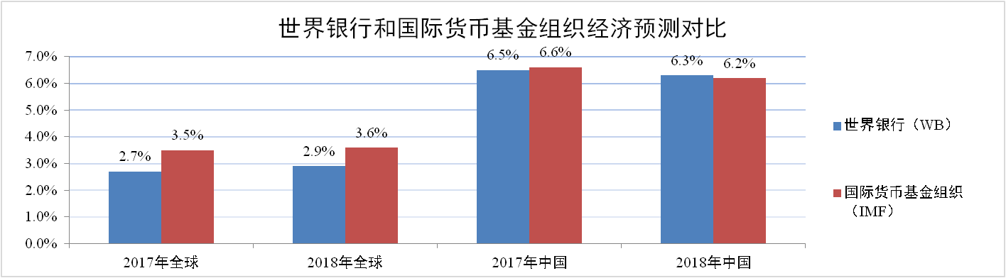世界銀行2017年6月《全球經(jīng)濟(jì)展望》數(shù)據(jù)顯示,隨著制造業(yè)和貿(mào)易回暖以及大宗商品價(jià)格趨穩(wěn),預(yù)計(jì)2017年和2018年全球經(jīng)濟(jì)增速分別為2.7%和2.9%;發(fā)達(dá)經(jīng)濟(jì)體經(jīng)濟(jì)增速分別為1.9%和1.8%;新興市場(chǎng)和發(fā)展中經(jīng)濟(jì)體經(jīng)濟(jì)增速分別為4.1%和4.5%;中國(guó)經(jīng)濟(jì)增速分別為6.5%和6.3%。
