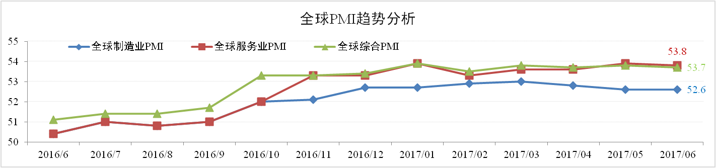 2017年以來,全球經(jīng)濟延續(xù)復蘇態(tài)勢。據(jù)市場調(diào)研機構(gòu)IHS Markit與摩根聯(lián)合發(fā)布的全球PMI數(shù)據(jù)顯示,6月全球制造業(yè)、服務業(yè)以及綜合PMI指數(shù)分別為53.8、53.7以及52.6,均處于擴張區(qū)間。同時6月亞太經(jīng)合組織將2017年全球經(jīng)濟增速預測由此前的3.3%調(diào)高至3.5%。