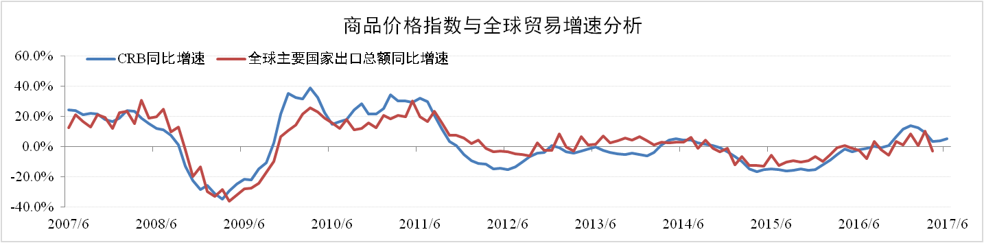 分析認為:本次全球貿(mào)易增速的提升更多的取決于商品價格增速。歷史數(shù)據(jù)表明商品價格指數(shù)總體上領先全球貿(mào)易增速約一個季度。目前商品價格增速已回落至低位企穩(wěn),表明全球商品價格已經(jīng)階段性見頂,全球貿(mào)易回暖增速或回落。