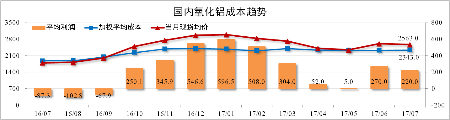 7月份,國內(nèi)氧化鋁行業(yè)加權(quán)平均成本2,343元/噸,環(huán)比上漲0.56%。其中,煤炭、片堿市場價格維持高位,鋁土礦價格小幅上漲。全國氧化鋁現(xiàn)貨成交均價小幅下跌至2,563元/噸。理論上來看,氧化鋁行業(yè)平均利潤水平約220元/噸。