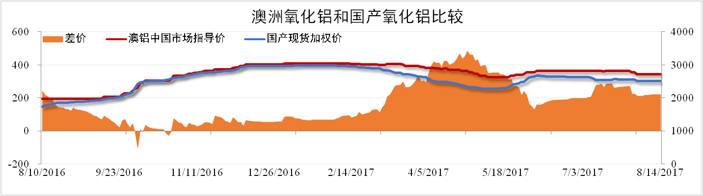 由于澳洲氧化鋁價格與國產(chǎn)氧化鋁價差偏高,因此澳洲進口氧化鋁價格開始走低。截止7月31日,澳洲氧化鋁中國市場指導(dǎo)價為2,775元/噸,環(huán)比下跌1.77%,國內(nèi)氧化鋁加權(quán)價格2,549元/噸,價差縮小至226元/噸。