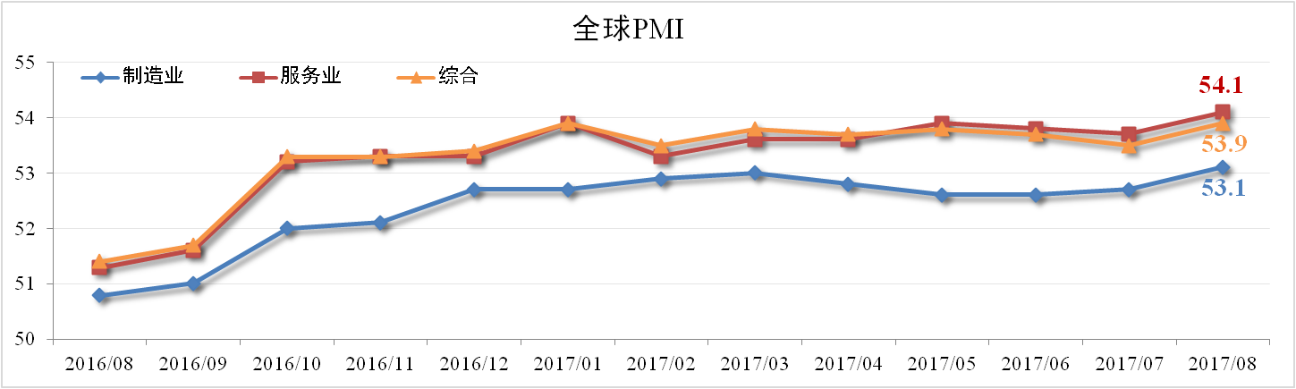 據(jù)HIS Markit與摩根大通發(fā)布的數(shù)據(jù)顯示,8月份全球綜合PMI為53.9,較7月擴(kuò)大0.4個(gè)百分點(diǎn),達(dá)2014年2月以來高點(diǎn)。其中服務(wù)業(yè)PMI為54.1,制造業(yè)PMI為53.1,均較上月擴(kuò)大0.4個(gè)百分點(diǎn)。