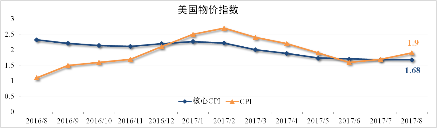 8月美國CPI為1.9%,核心CPI1.68%,雙雙超出市場預(yù)期。受颶風(fēng)哈維影響,墨西哥灣地區(qū)煉油廠被迫停產(chǎn),颶風(fēng)沿線地區(qū)600多萬人口遷移,帶動(dòng)沿途汽油價(jià)格與房屋租金上漲,成為此次支撐CPI上漲的主要原因。