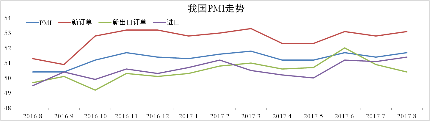 8月份我國制造業(yè)PMI為51.7,較上月上漲0.3,處于擴張區(qū)間。分項中,生產(chǎn)自53.5上升至54.1,新出口訂單自50.9下降至50.4,進口訂單自51.1上升至51.4,主要原材料購進價格自57.9大漲7.4個百分點至65.3。