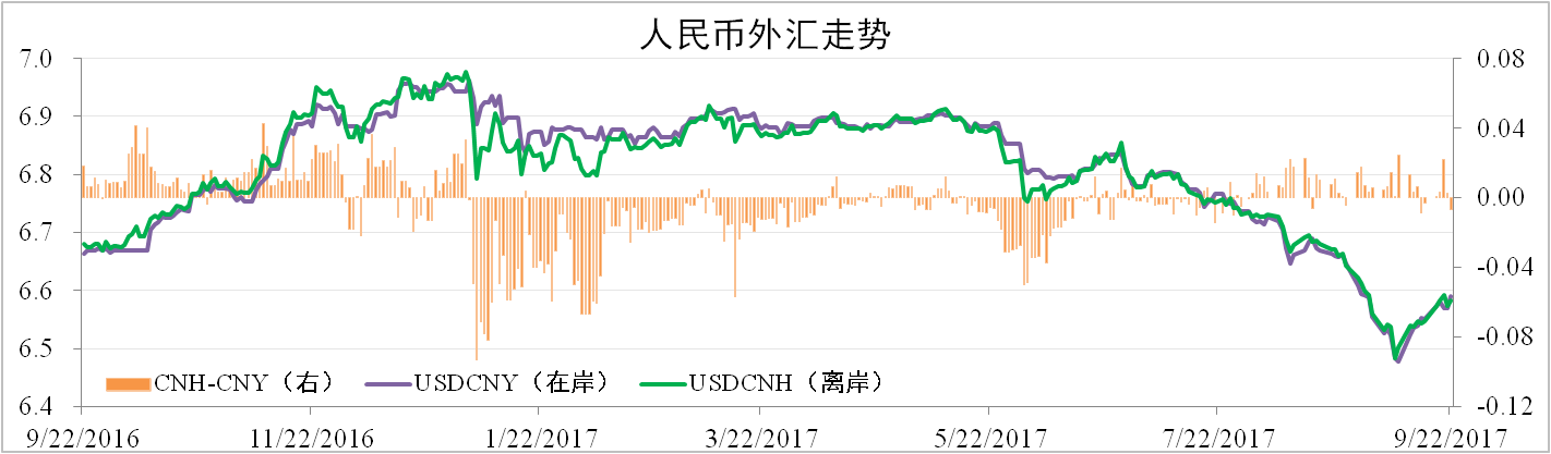 8月至9月中旬人民幣匯率呈“V”形走勢。截至9月22日,離岸人民幣匯率為6.5828,較9月7日的近一年最高點貶值1.53%,較8月22日升值1.16%。據(jù)央行通知,9月11日起,人民幣外匯風(fēng)險準(zhǔn)備金自原有20%調(diào)整至0%。