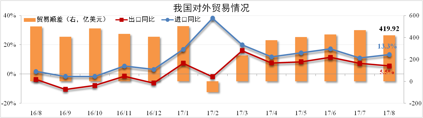 據(jù)海關(guān)總署數(shù)據(jù),8月份我國進口量為1572.37億美元,同比上漲13.3%,較7月擴大2.3個百分點;出口量為1992.29億美元,同比上漲5.5%,較7月縮小1.7個百分點。貿(mào)易順差為419.92億美元,較上月下降10.15%。