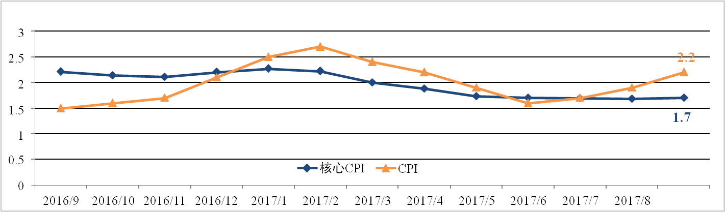 美國9月物價指數(shù)增速回升,但略低于市場預(yù)期。9月美國CPI為2.2%,較 上月擴大0.3個百分點,核心CPI為1.7%,與上月基本持平。颶風(fēng)襲擊美國產(chǎn) 油區(qū)造成能源產(chǎn)能下降推高原油價格是CPI上漲的主要原因。