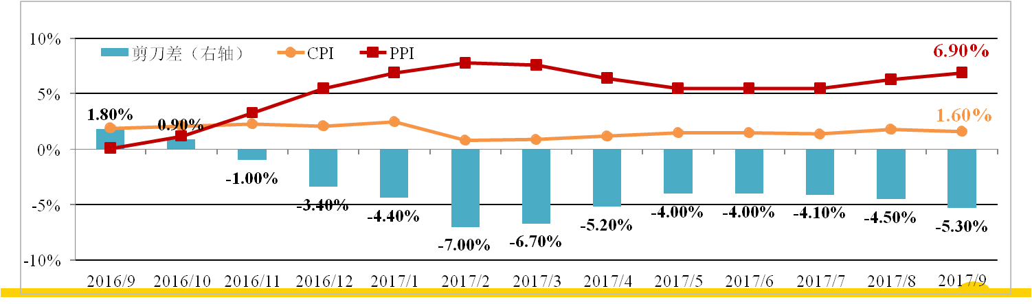 9月份我國CPI為1.6%,較上月縮小0.2個(gè)百分點(diǎn),略低于市場預(yù)期,蔬菜 價(jià)格增速大幅放緩是主要原因,而核心CPI從2.2%升至2.3%,顯示價(jià)格正向下 游傳導(dǎo)。 受9月上半月黑色、有色大漲影響,PPI為6.9%,大超市場預(yù)期。