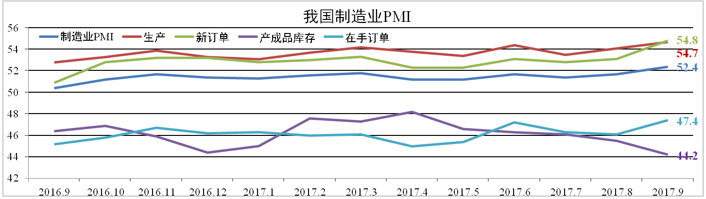 9月份我國官方制造業(yè)PMI為52.4,創(chuàng)下自2012年5月以來最高點(diǎn)。分項(xiàng)中, 在手訂單、新訂單分別擴(kuò)大1.3、1.7個(gè)百分點(diǎn)至47.4以及54.8,產(chǎn)成品庫存縮小 1.3個(gè)百分點(diǎn)至44.2,生產(chǎn)上升0.6個(gè)百分點(diǎn)至54.7。