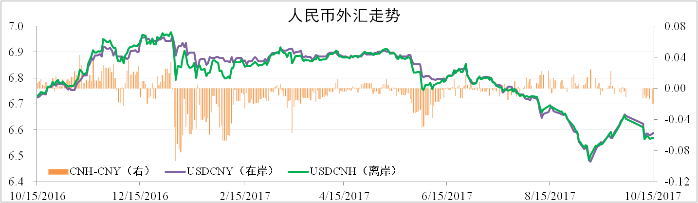 由于美聯(lián)儲(chǔ)縮表以及長假居民購匯需求增加等原因,人民幣貶值。但美 朝局勢動(dòng)蕩,加之美國通脹疲軟,美元轉(zhuǎn)弱。截至10月15日,在岸人民幣匯 率為6.5884,環(huán)比貶值0.59%,離岸人民幣為6.5689,環(huán)比貶值0.37%。