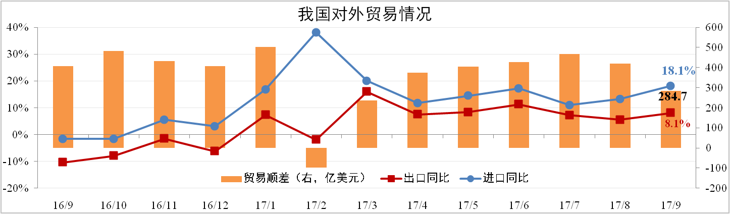 分析認(rèn)為:9月進(jìn)口大幅上升一方面反映國內(nèi)需求韌性較強(qiáng),下滑不顯著,另一方面環(huán)保造成生產(chǎn)受限,需要更多的進(jìn)口來彌補(bǔ)國內(nèi)生產(chǎn)的不足。對美順差擴(kuò)大或?qū)μ乩势?1月訪華提供談判籌碼,對出口造成不利影響。