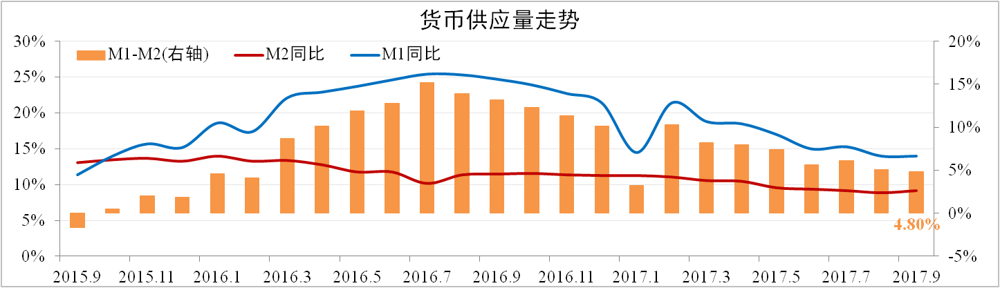 分析認(rèn)為:受上游盈利轉(zhuǎn)好以及產(chǎn)能擴(kuò)張受限影響,企業(yè)部門融資需求有走弱趨勢。另外“金九”慘淡收場,房產(chǎn)調(diào)控趨嚴(yán),旺季不旺。綜合來看,M2回升動(dòng)能不強(qiáng)。預(yù)計(jì)10月貨幣供應(yīng)依然偏弱。
