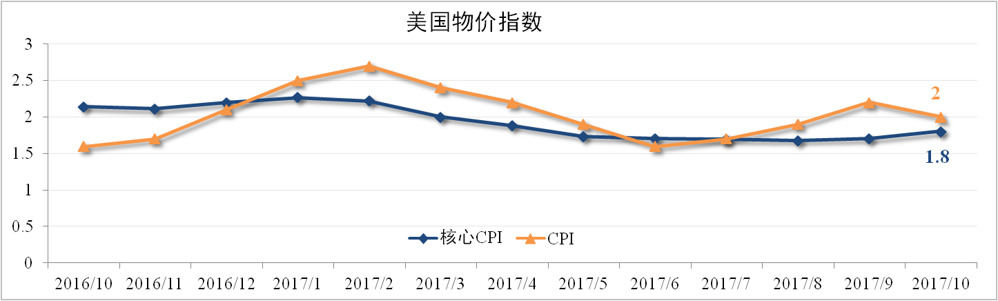 10月美國CPI為2%,較上月下滑0.2個百分點,復合市場預期,主要原因是颶風影響的能源供給恢復從而導致能源價格下跌。剔除能源項的核心CPI終結了連續(xù)4個月的持平,較上月擴大0.1個百分點報1.8%,超出市場預期。