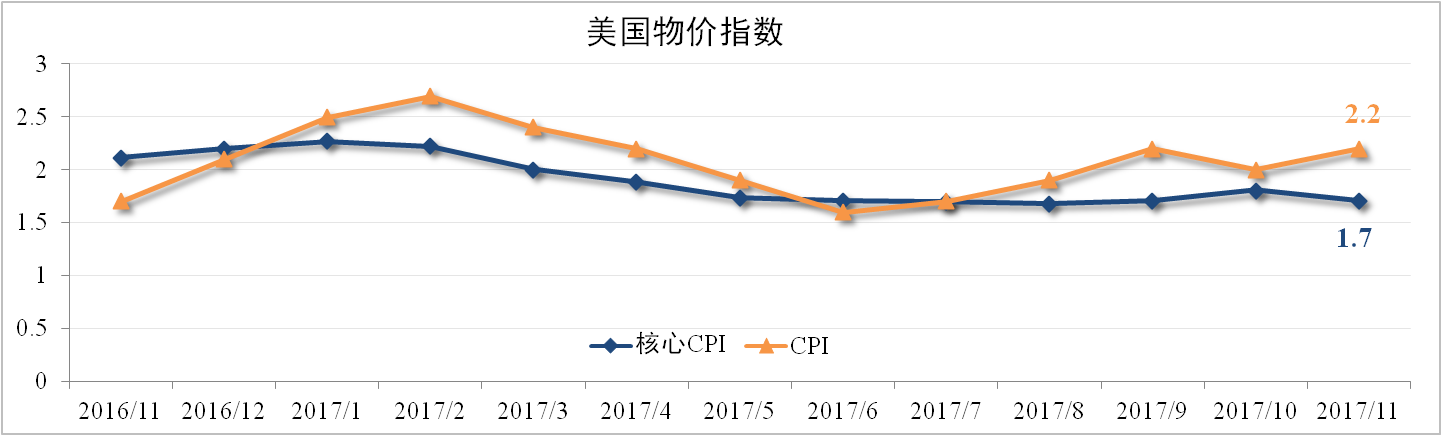 11月美國CPI為2.2%,符合市場預(yù)期,主要受能源價格上漲提振。剔除能源因素的核心CPI為1.7%,較上月下滑0.1個百分點,低于市場預(yù)期,主要是受住房價格增速放緩以及醫(yī)療服務(wù)價格下跌影響所致。