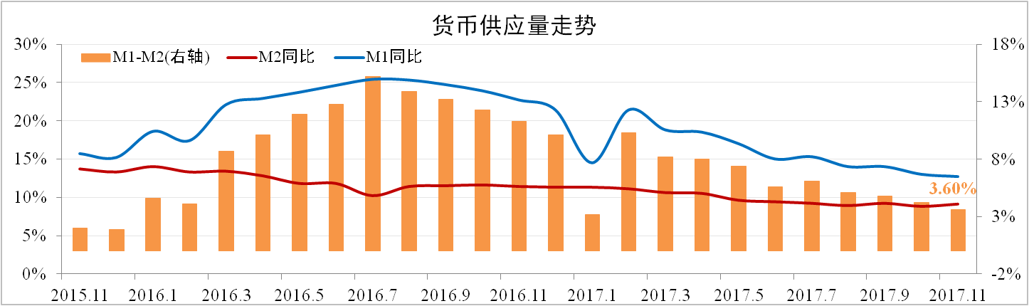 分析認(rèn)為:貸款增加與財(cái)政存款支出增加是M2增長的主要原因。一方面銀行減少非標(biāo)投資轉(zhuǎn)向企業(yè)貸款,另一方面雙十一刺激居民短期消費(fèi)貸增加。考慮到季末效應(yīng)以及信貸投放額度,預(yù)計(jì)12月M2增速有小幅放緩。