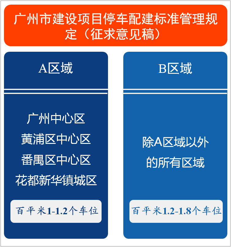 11月17日,廣州市政府發(fā)布《廣州市建設項目停車配建標準管理規(guī)定(征求意見稿)》。規(guī)定新建、改建、擴建的住宅類建設項目及大于500平方米的公共建筑類、工業(yè)建筑類建設項目,按A、B兩區(qū)域進行劃分規(guī)定。