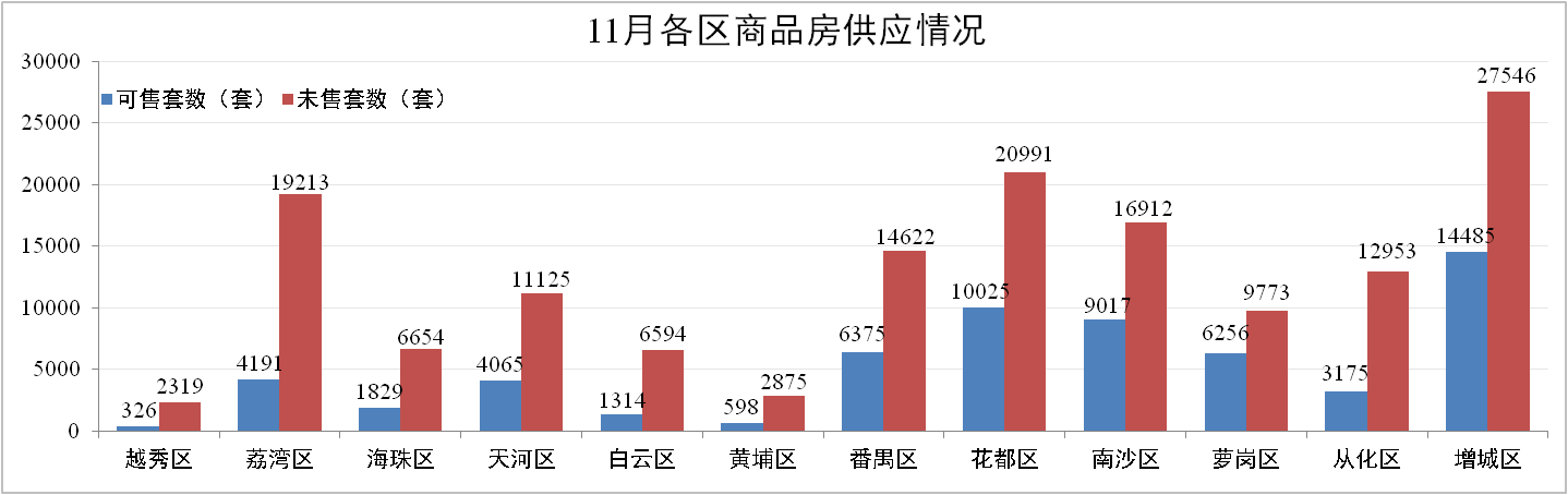 11月30日,廣州市新建住宅商品房供應(yīng)共151,577套,環(huán)比上升7.6%,其中:可售住宅商品房為61,656套,占比40.68%?;ǘ肌⒃龀?、番禺、南沙仍保持最高供應(yīng)量,可售和未售房源累計占全市比例分別為64.72%和52.83% 。