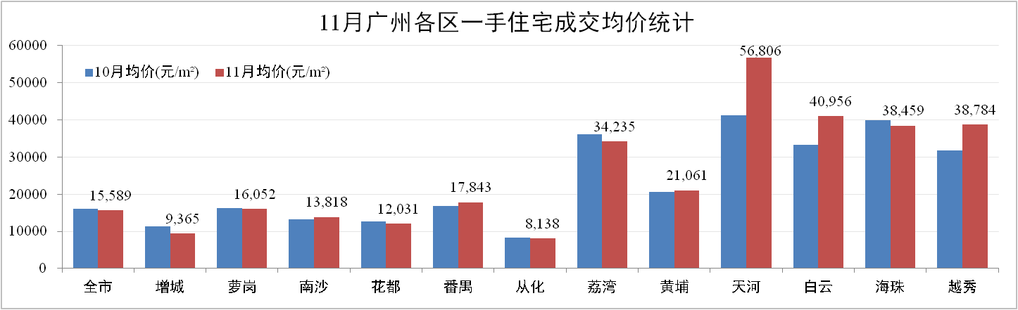 網(wǎng)簽價方面:11月份廣州一手住宅成交均價15,589元/m2,環(huán)比下跌3.10%。其中,增城成交均價僅為9,365元/m2,環(huán)比下跌16.72%。市內(nèi)核心區(qū)域均有不同程度升幅,整體拉動市場均價平穩(wěn)。