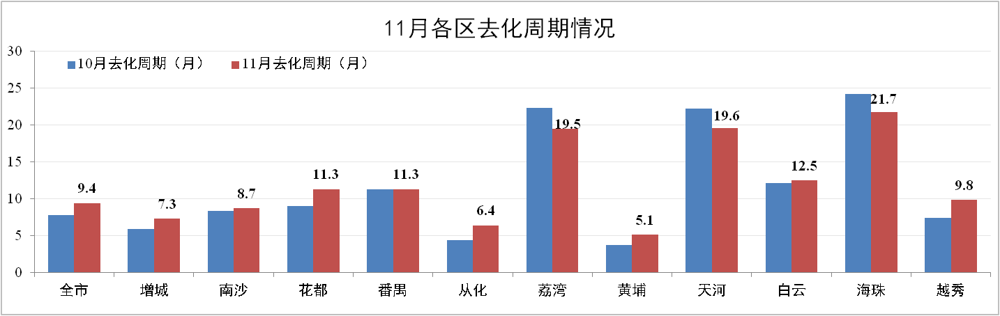 11月份廣州住宅地產(chǎn)去化周期為9.4個月,環(huán)比10月增加1.6個月,總體庫存量為763.68萬m²,增城、花都等熱門區(qū)域由于新批預(yù)售集中在11月,拉動整體庫存量增加。