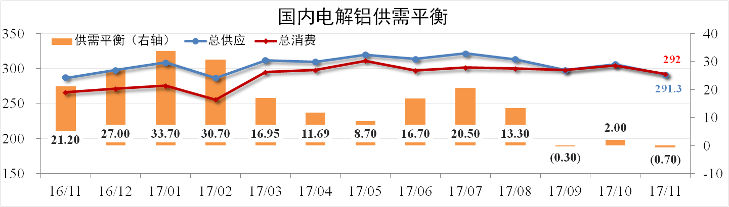 據(jù)阿拉丁數(shù)據(jù),11月份我國電解鋁產(chǎn)量291萬噸,同比上漲1.43%,環(huán)比下跌4.8%。凈進(jìn)口0.3萬噸,總供應(yīng)量291.3萬噸,總消費量292萬噸,從靜態(tài)數(shù)據(jù)看,當(dāng)月理論供應(yīng)短缺0.7萬噸。