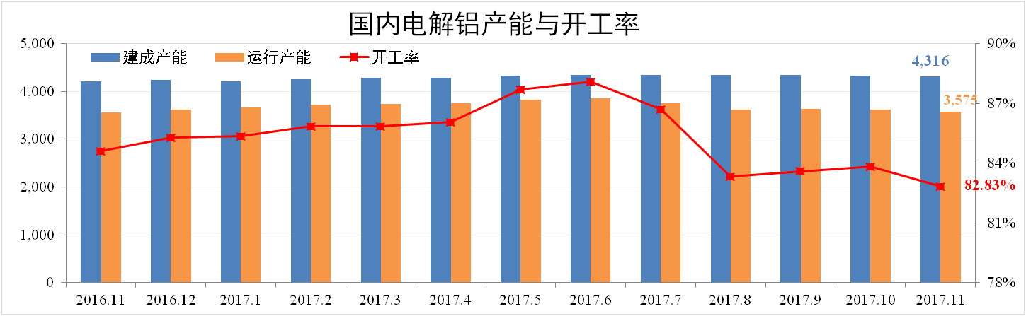 11月份中國電解鋁總產(chǎn)能4,316萬噸,運行產(chǎn)能3,575萬噸,開工率82.83%,其中運行產(chǎn)能環(huán)比下降1.4%。據(jù)百川資訊統(tǒng)計,截至12月7日,2017年中國電解鋁累計已減產(chǎn)494.8萬噸,已確定待減產(chǎn)19.7萬噸,年內(nèi)累計已復(fù)產(chǎn)143.8萬噸。