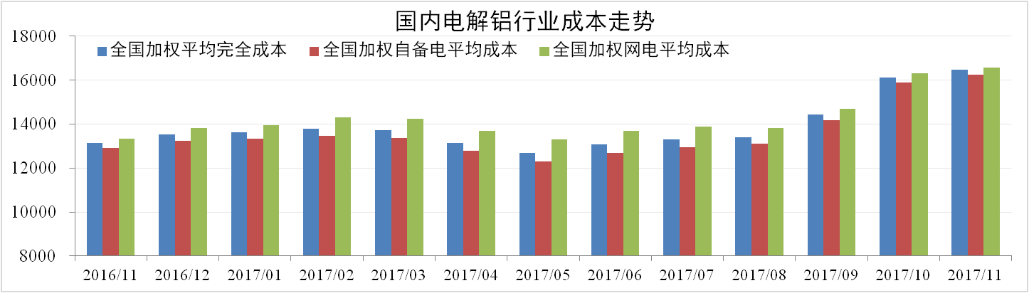 分析認(rèn)為:氧化鋁行業(yè)減產(chǎn)后市場仍需時間消化過剩庫存,氧化鋁價格將持續(xù)走弱。電解鋁實際減產(chǎn)不及預(yù)期,陽極供應(yīng)緊張價格堅挺,另外部分地區(qū)燃煤供暖回歸,煤炭價格大漲,綜合來看預(yù)計12月電解鋁成本仍會上漲。