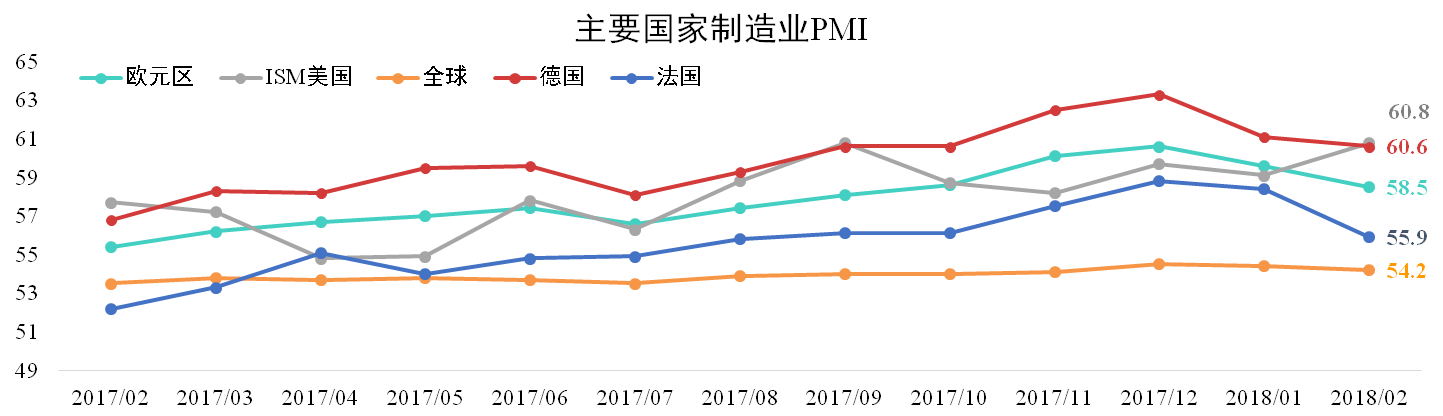 全球經(jīng)濟(jì)景氣程度有所放緩,且發(fā)達(dá)國(guó)家之間出現(xiàn)分化。2月份全球制造業(yè)PMI為54.2,較上月下滑0.2點(diǎn)。歐洲國(guó)家PMI普遍下滑,但仍處于擴(kuò)張區(qū)間,美國(guó)ISM制造業(yè)PMI為60.8,較上月大幅擴(kuò)大2.4點(diǎn)。