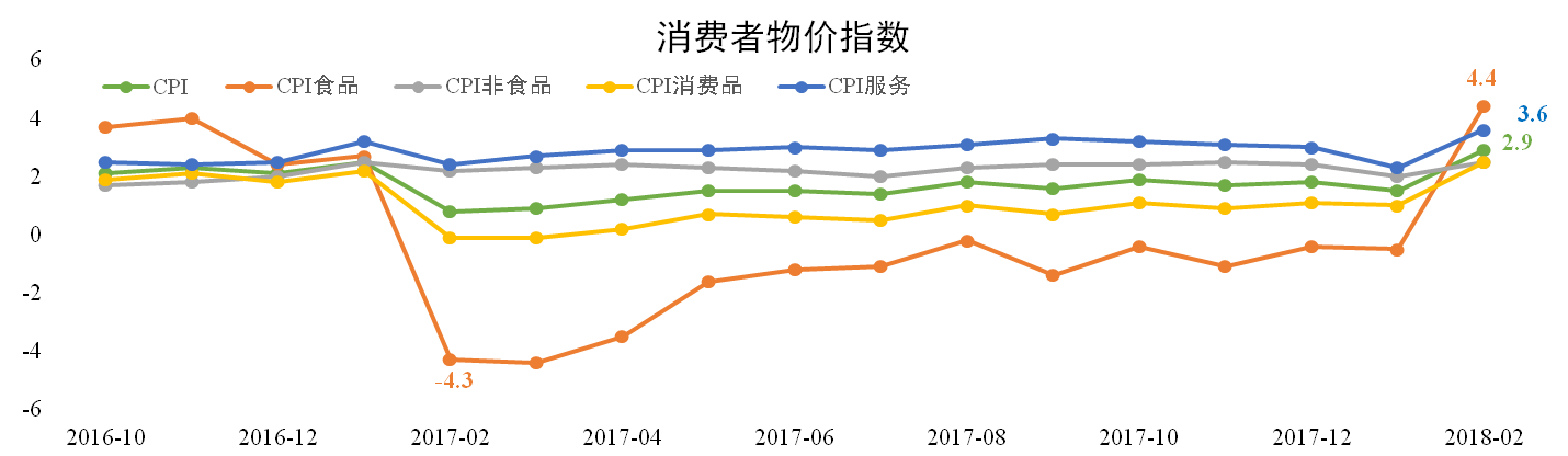 受春節(jié)錯位影響,食品價格同比大幅上升,拉動CPI上揚(yáng)。據(jù)統(tǒng)計(jì)局?jǐn)?shù)據(jù),2月份我國CPI同比為2.9%,較上月擴(kuò)大1.4個百分點(diǎn),為2013年11月以來的最高值。主要分項(xiàng)均有不同程度上漲,其中食品同比上漲4.4%。