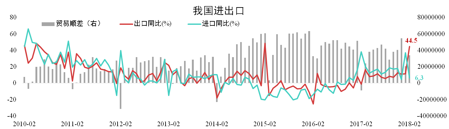 進(jìn)出口增速出現(xiàn)分化,內(nèi)需有轉(zhuǎn)弱跡象。2月份出口同比增長44.5%,較上月大幅回暖;進(jìn)口同比下滑30.3個百分點(diǎn)至6.3%。貿(mào)易順差337億美元,其中對美貿(mào)易順差210億美元,對美順差擴(kuò)大態(tài)勢并未轉(zhuǎn)變。