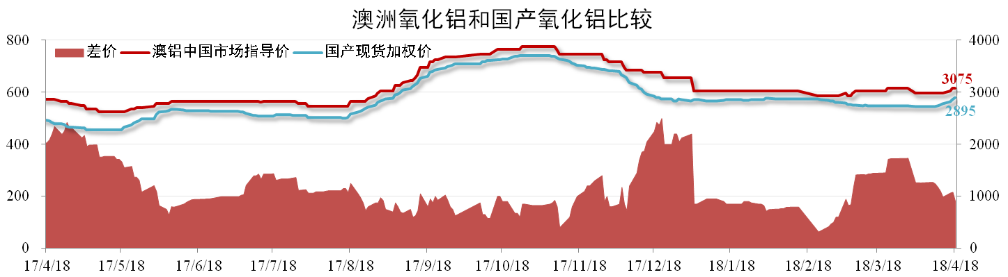 截至4月18日,國產(chǎn)氧化鋁現(xiàn)貨加權均價為2895元/噸,同比上升18.03%,環(huán)比上升5.82%。澳鋁中國市場指導價為3075元/噸,環(huán)比上升1.65%,二者價差180元/噸,較上月同期縮窄109元/噸。