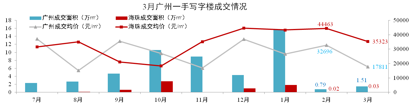 3月,廣州一手寫字樓成交1.51萬m²,環(huán)比上升23%,成交均價(jià)17,811元/m²,環(huán)比下跌36%。其中海珠區(qū)成交0.03萬㎡,環(huán)比上升50%,成交均價(jià)35,323元/㎡,環(huán)比下降21%。