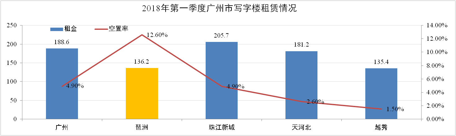 根據(jù)戴德梁行《2018年廣州市第一季度寫字樓速遞》報(bào)告,2018第一季度廣州市甲級(jí)寫字樓租金為188.6元/㎡/月,環(huán)比上升3.9%;琶洲市場(chǎng)平均租金136.2元/㎡/月,環(huán)比上升4.9%。全市空置率為4.9%,琶洲空置率為12.6%。