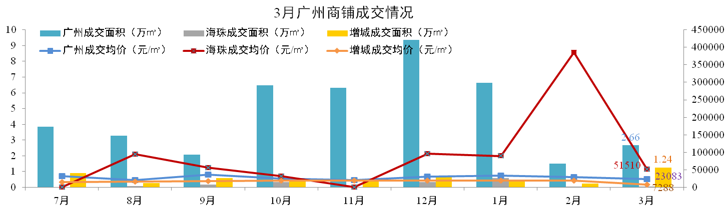 3月廣州一手商鋪成交2.66萬㎡,環(huán)比增加88%。海珠區(qū)成交0.01萬㎡,增城市場(chǎng)成交1.24萬平米,環(huán)比上升474%。全市成交均價(jià)23,083元/㎡,環(huán)比下降18%,海珠區(qū)均價(jià)51,510元/㎡,增城區(qū)均價(jià)7,288元/㎡。